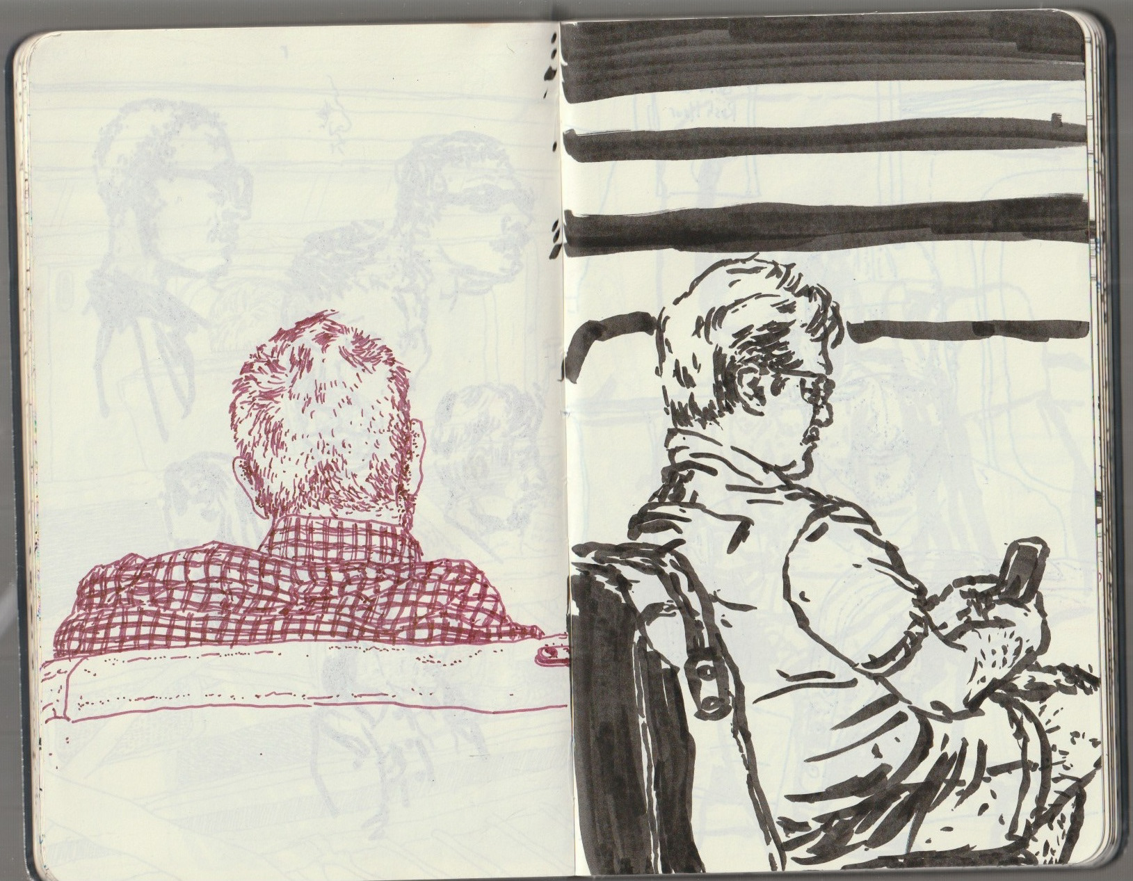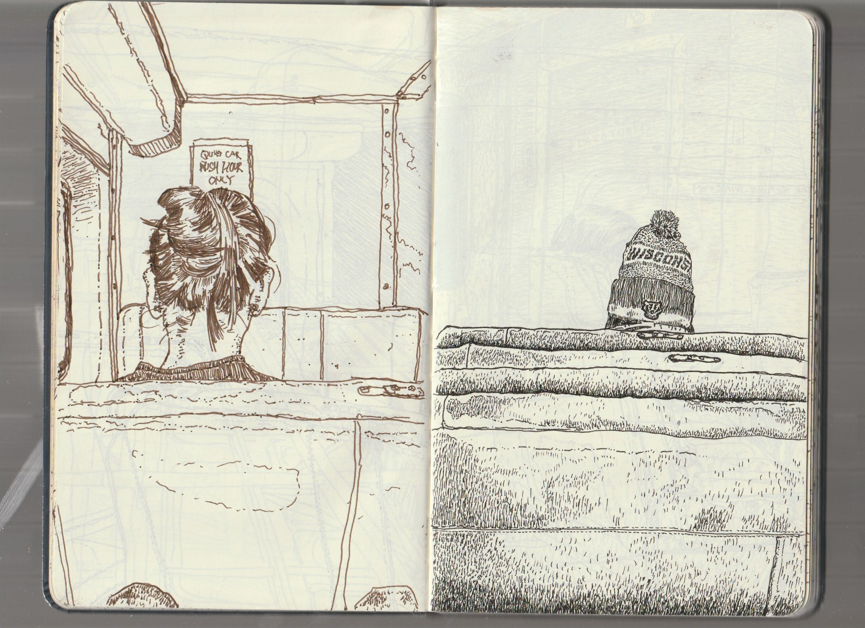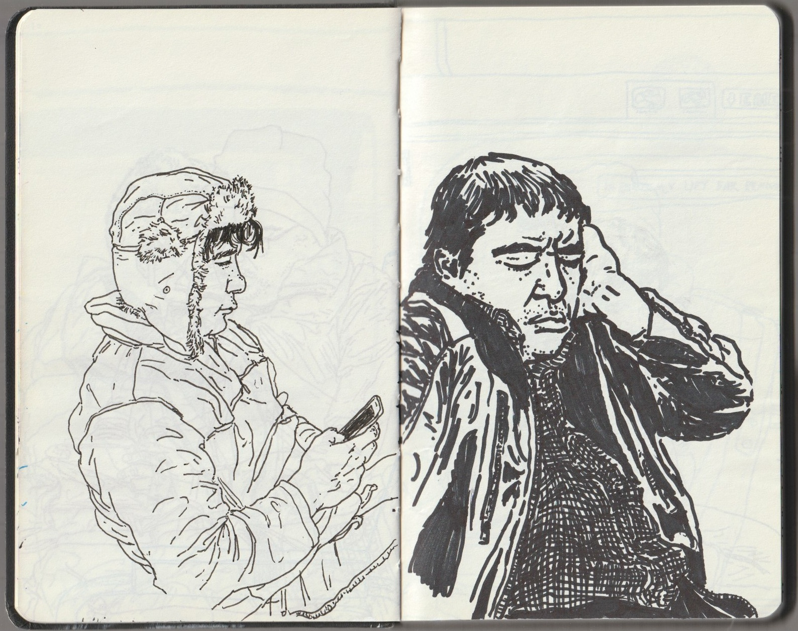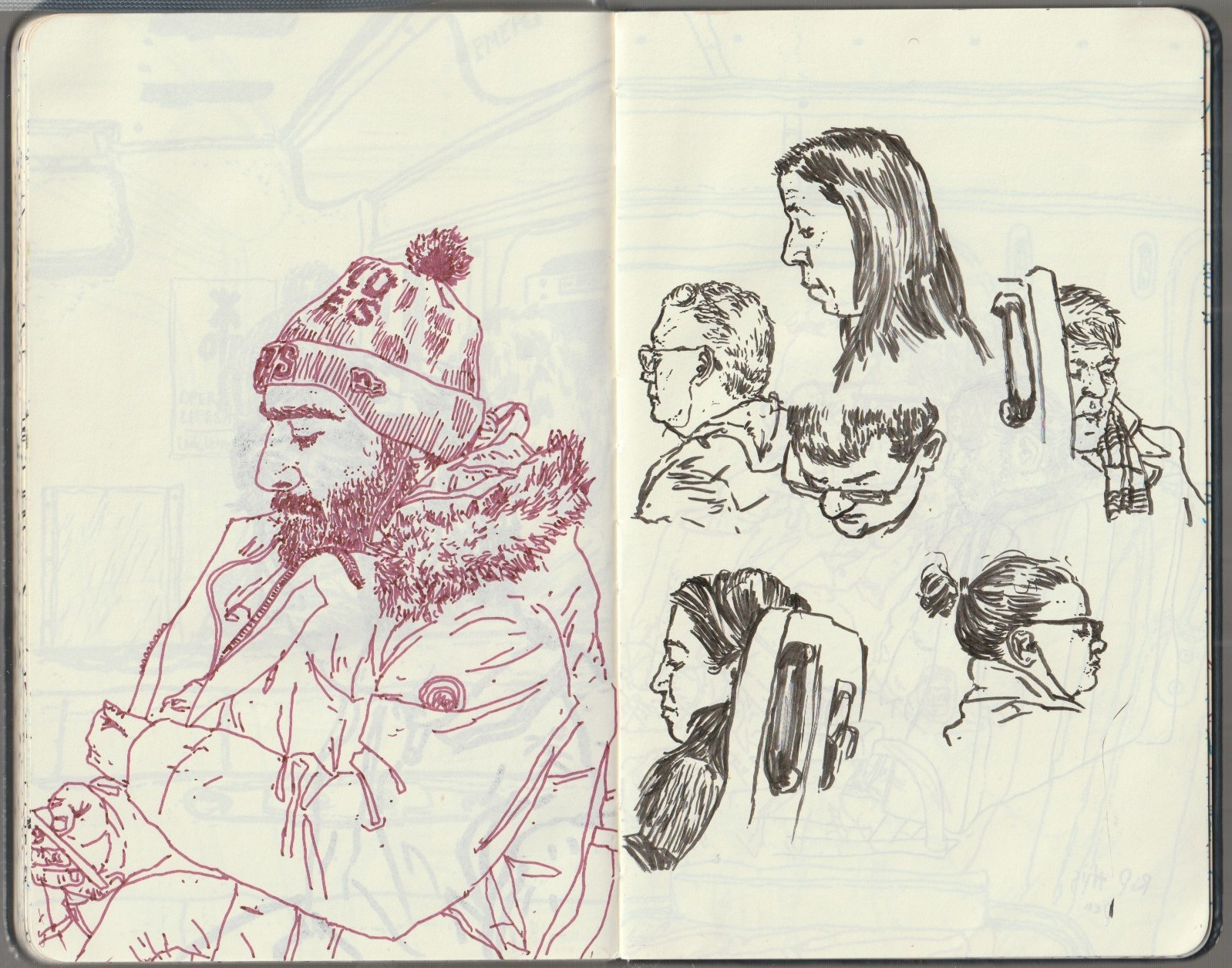 A selection of drawings from a multi-year pen and ink sketchbook project depicting my fellow Metra riders.