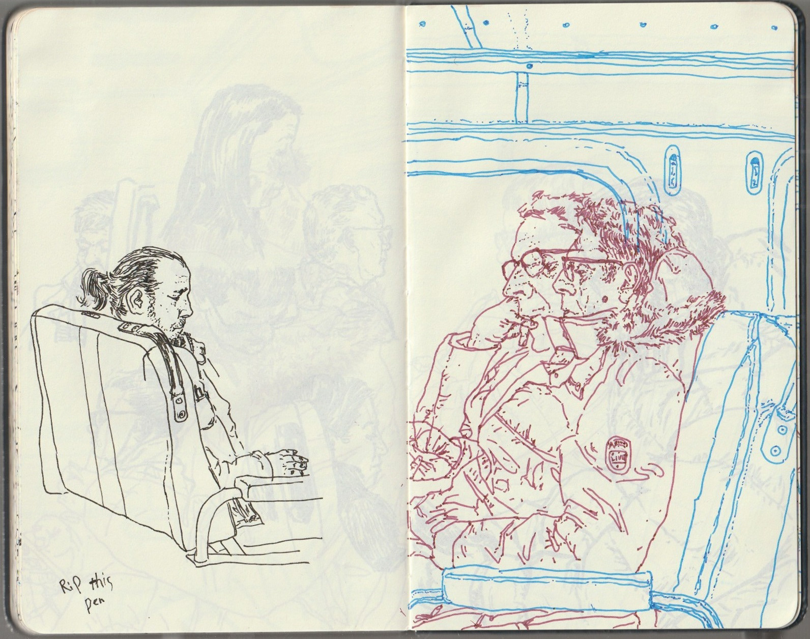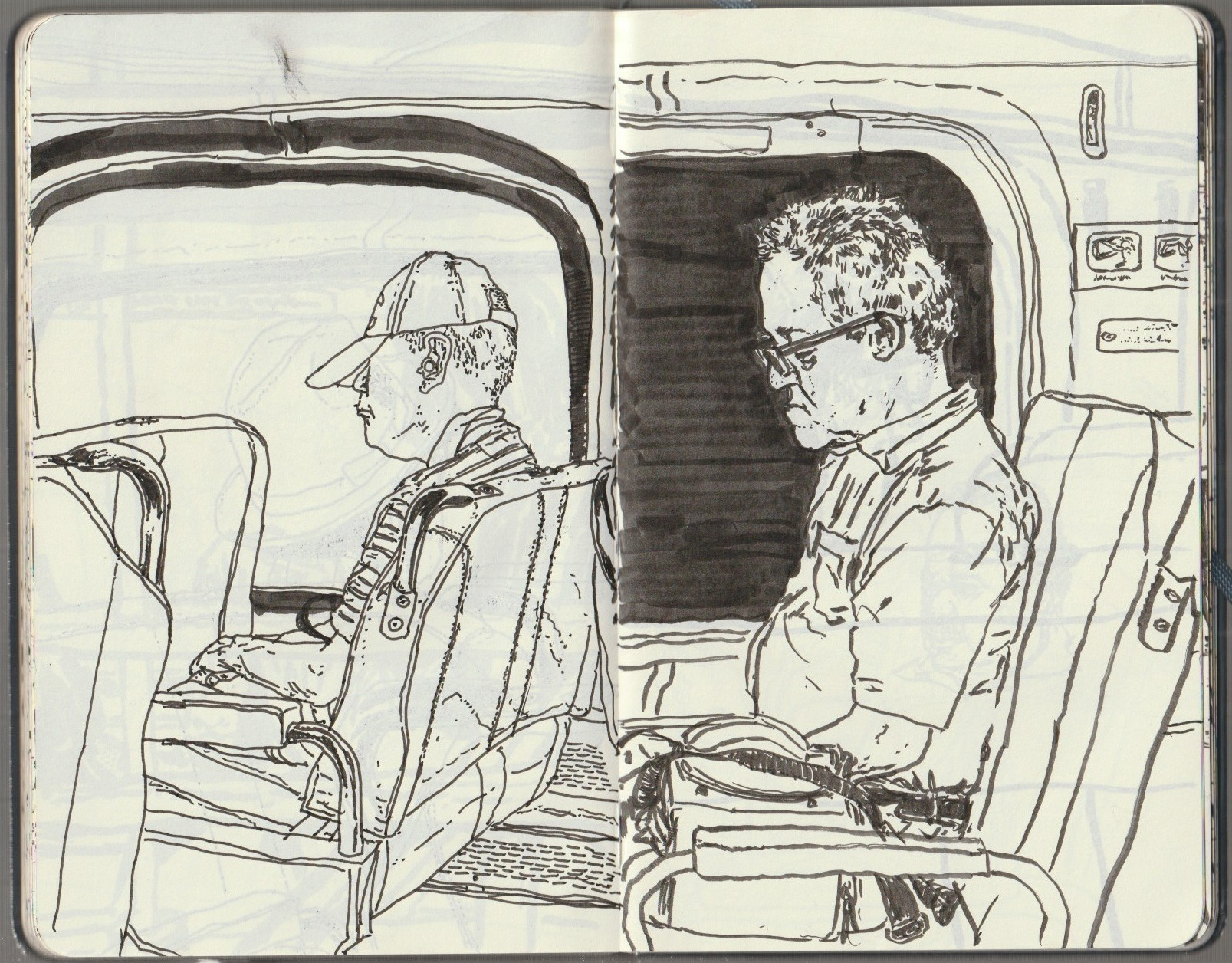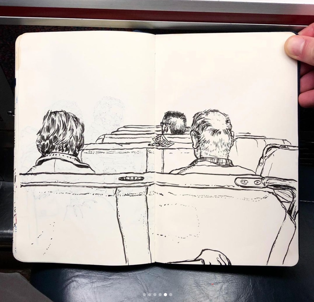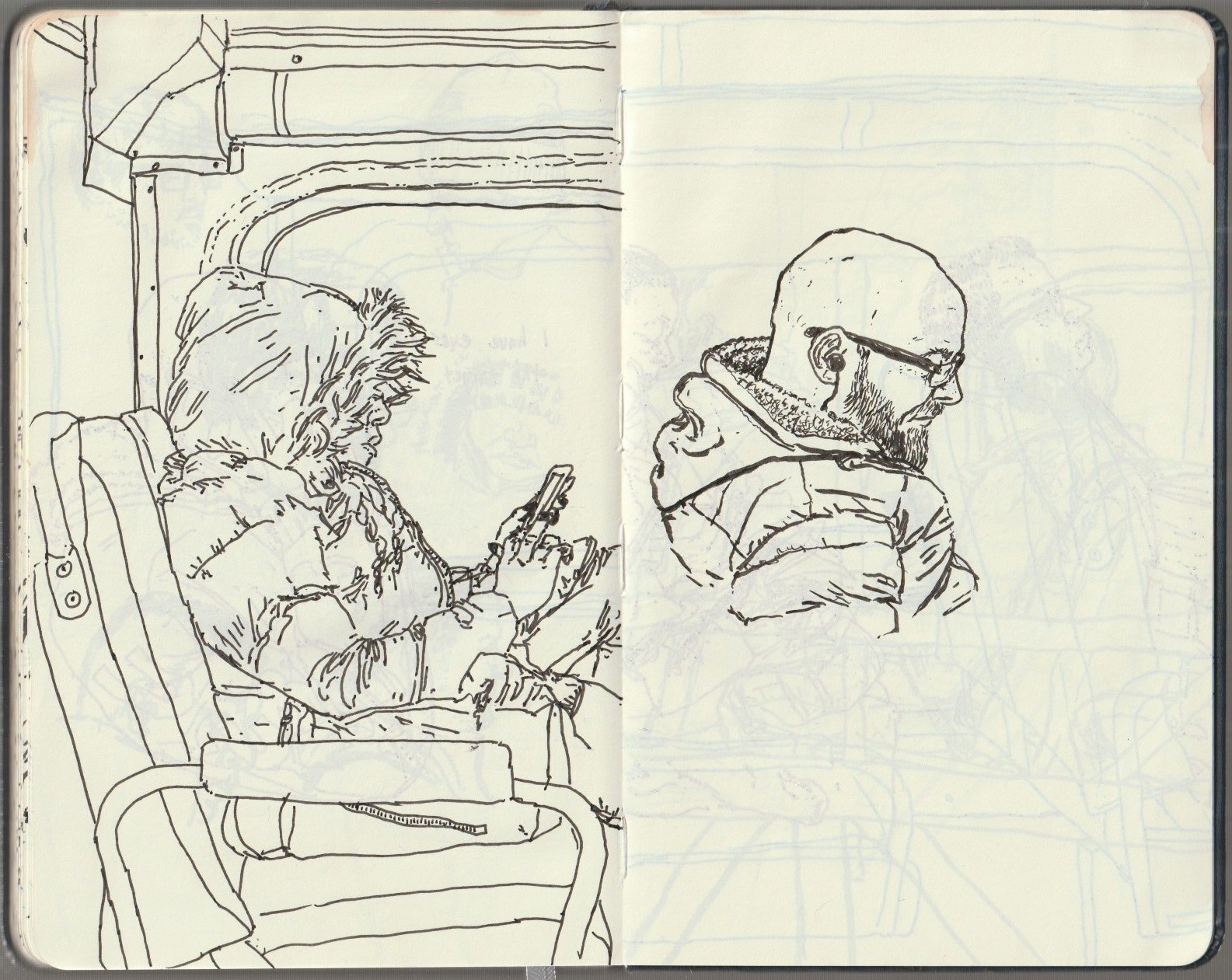 A selection of drawings from a multi-year pen and ink sketchbook project depicting my fellow Metra riders.
