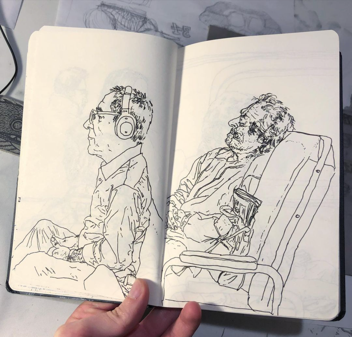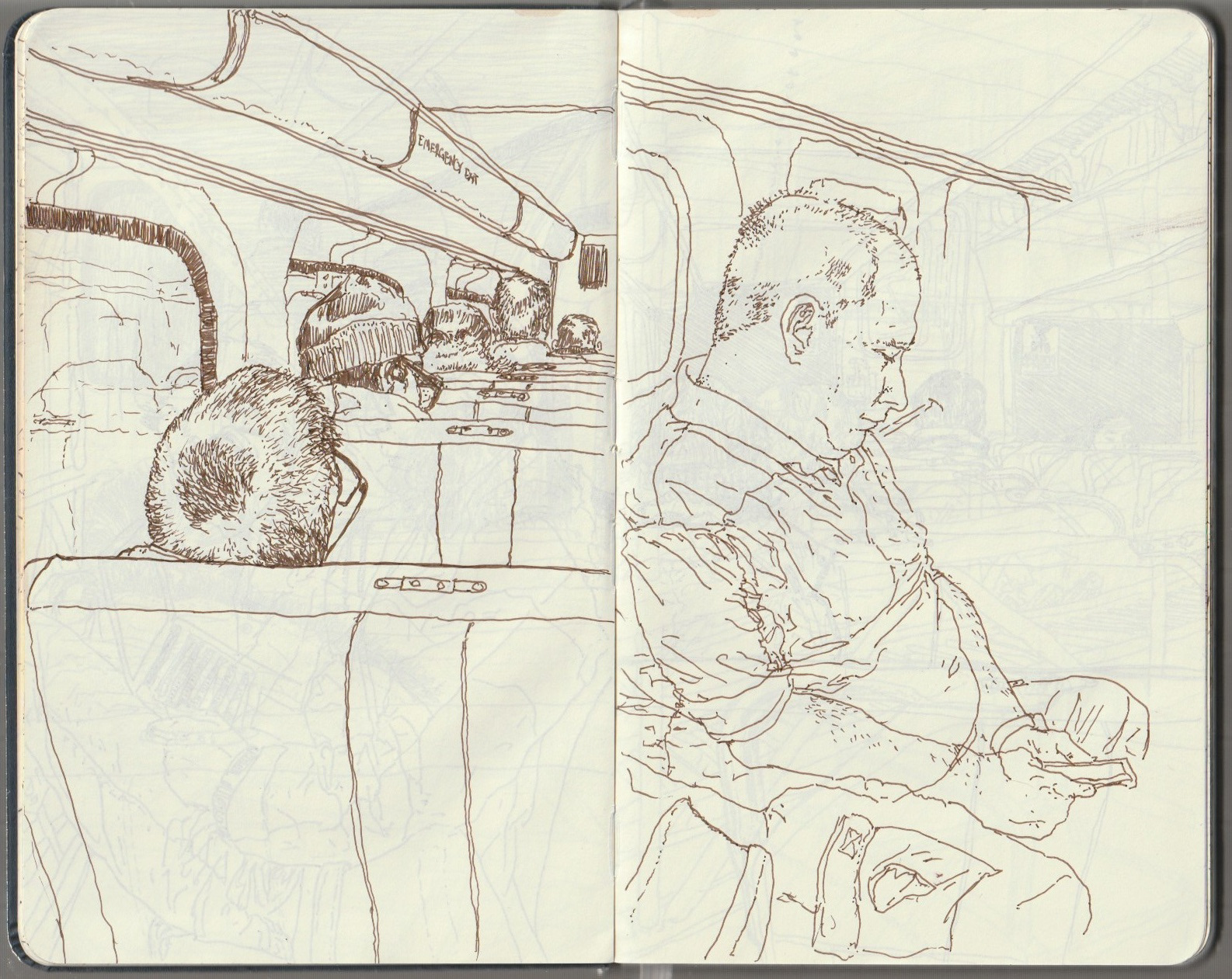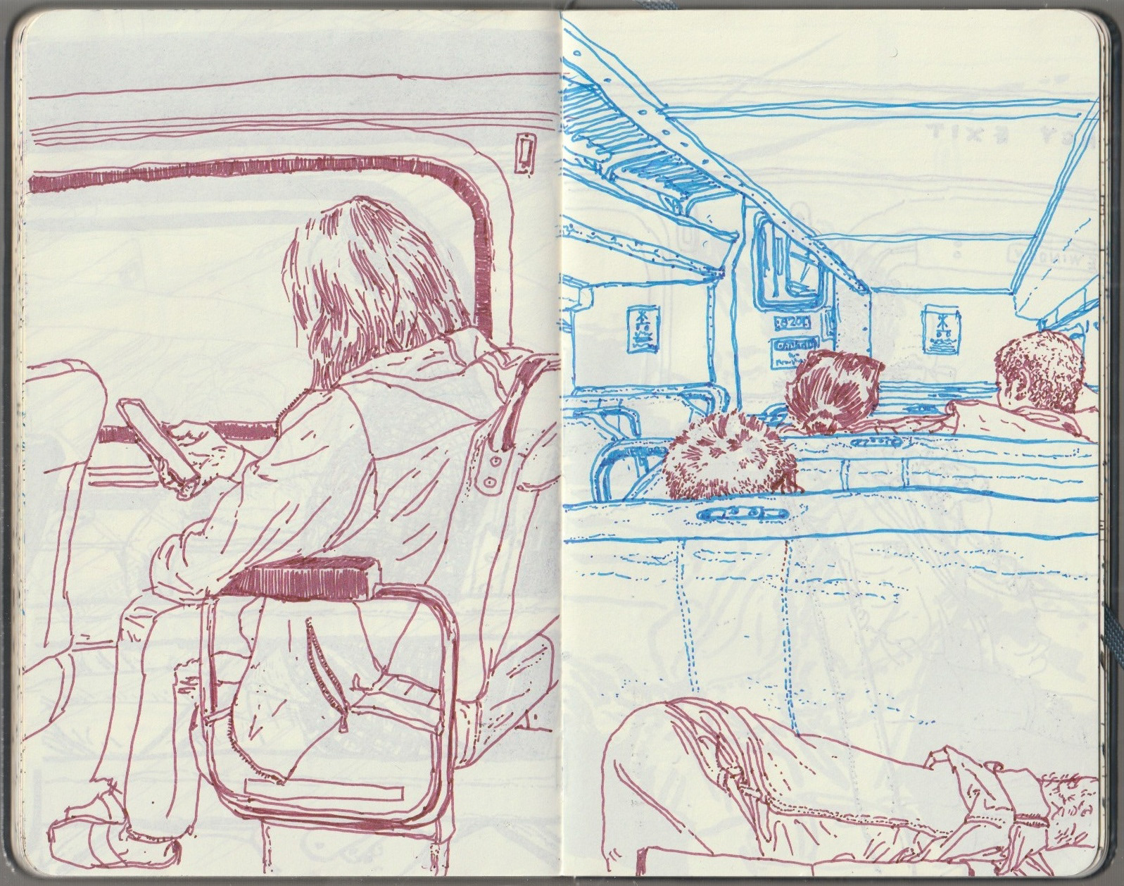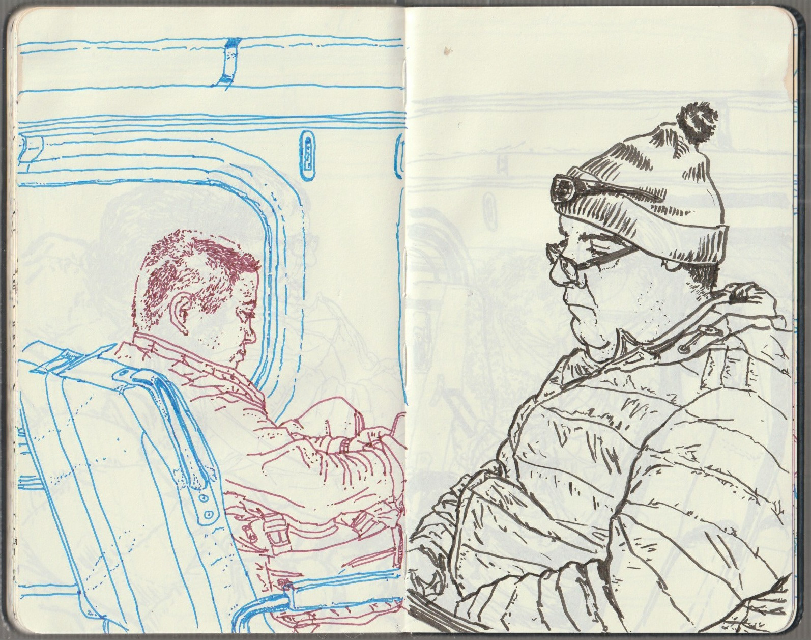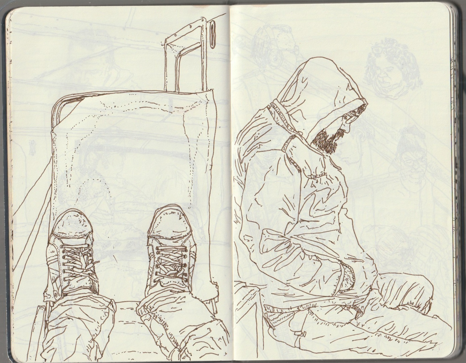 A selection of drawings from a multi-year pen and ink sketchbook project depicting my fellow Metra riders.