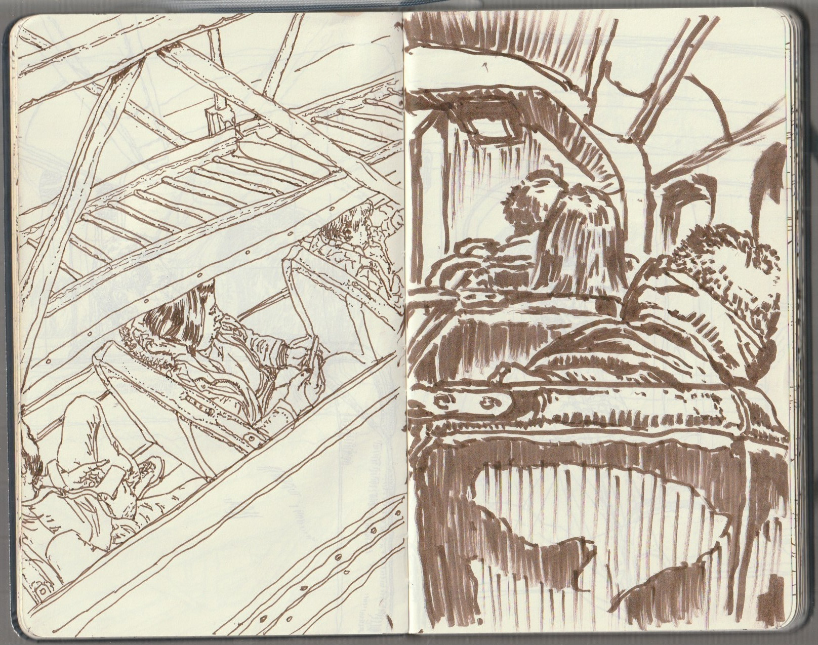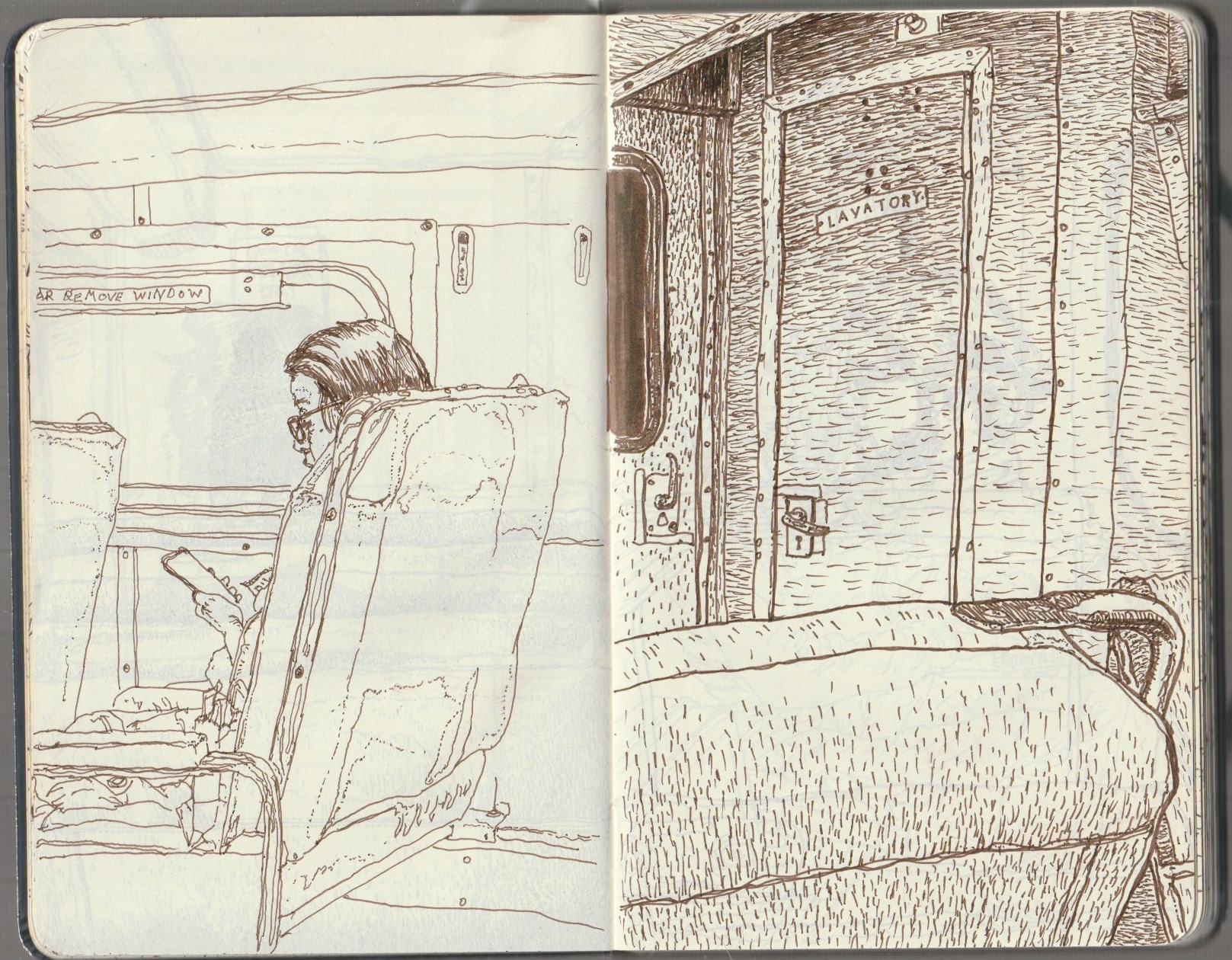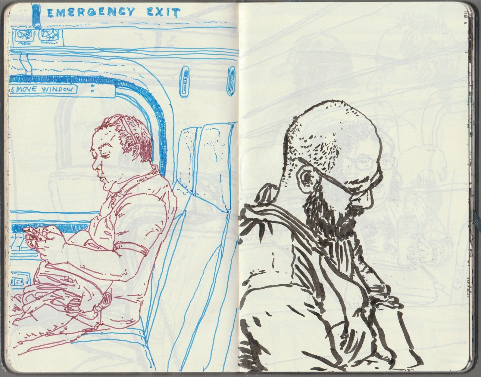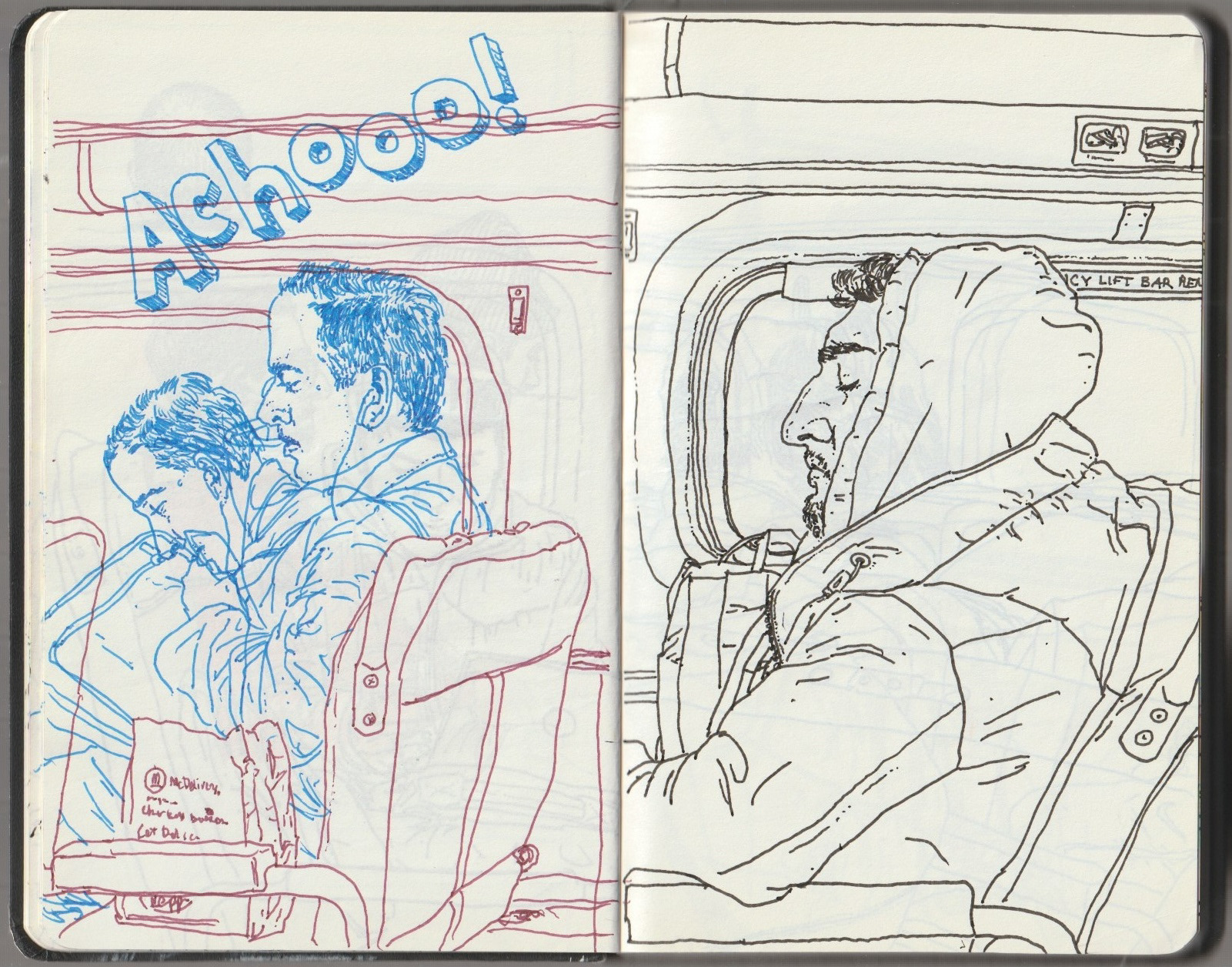 A selection of drawings from a multi-year pen and ink sketchbook project depicting my fellow Metra riders.