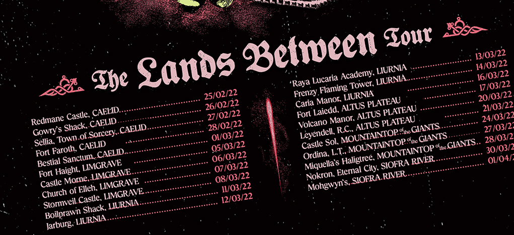 "Tour merch" for Scarlet Rot, a band who takes their name and song concepts from the video game Elden Ring. The Lands Between tour dates reference in-game locations instead of real-world venues, making this a tongue-in-cheek merch item.