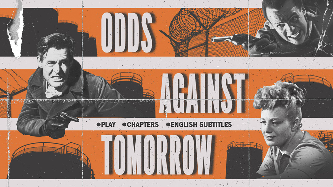 Full DVD and Blu-Ray packaging (plus menu interfaces) for the 1956 crime thriller Odds Against Tomorrow.